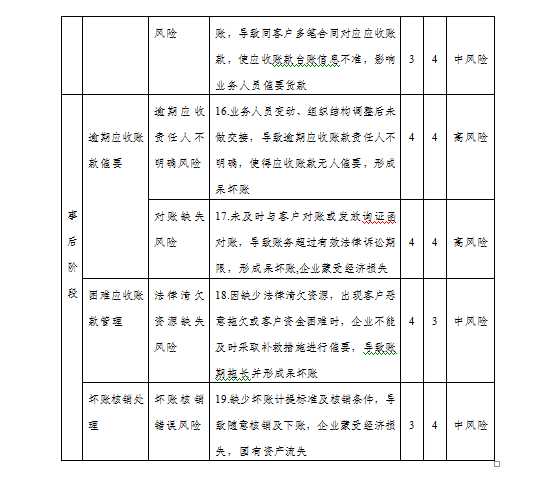 3.事后阶段。查阅应收账款成因的判断标准和流程。企业从市场环境、产品和行业付款特点业务人员及货款催收责任人主观意识、客户资金及资信状况、企业内部管理原因等方面对应收账款成因及影响因素进行了分析,根据应收账款的账龄、逾期情况,按照应收账款风险发生的可能性将应收账款分为I级、Ⅱ级、Ⅲ级及IV级4个等级:I级风险等级最低,为未到期应收账款;Ⅱ级为本年新增应收未按期收回账款;Ⅱ级为往年存量逾期应收账款;确认回收存在困难的,应收账款等级变为ⅣV级。查阅催款单、律师函、询证函等催收单据以及企业法律部门研究诉讼等法律催要记录,通过与外部专业律所、催要机构合作采用“委外清欠”方式加强账龄长、回收困难的应收账款数据。