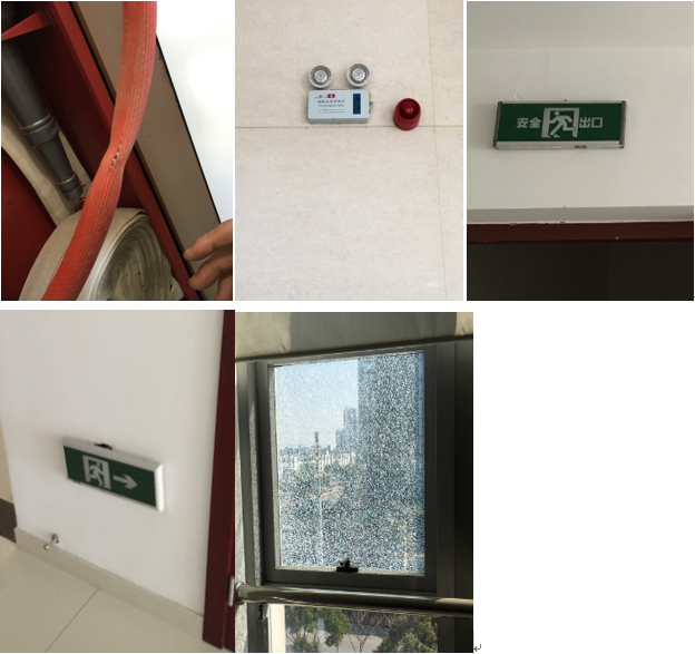 2. 物流服务大厦5F:1.检查消火栓白色水管带、红色软管已老化,需尽快更换;2.检查灭火器1个欠压;3.检查安全出口灯、安全疏散指示灯多个不亮;4.消防应急照明灯2个不亮;5.检查南面办公室1块碎裂。