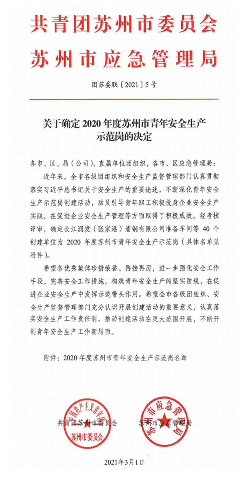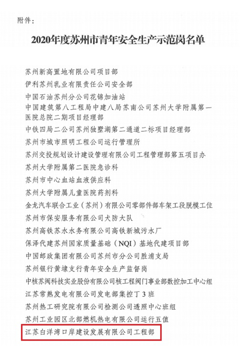 近日,共青团苏州市委员会苏州市应急管理局公布了2020年度苏州市青年安全生产示范岗名单,江苏白洋湾口岸建设发展有限公司工程部荣获 “青年安全生产示范岗”。