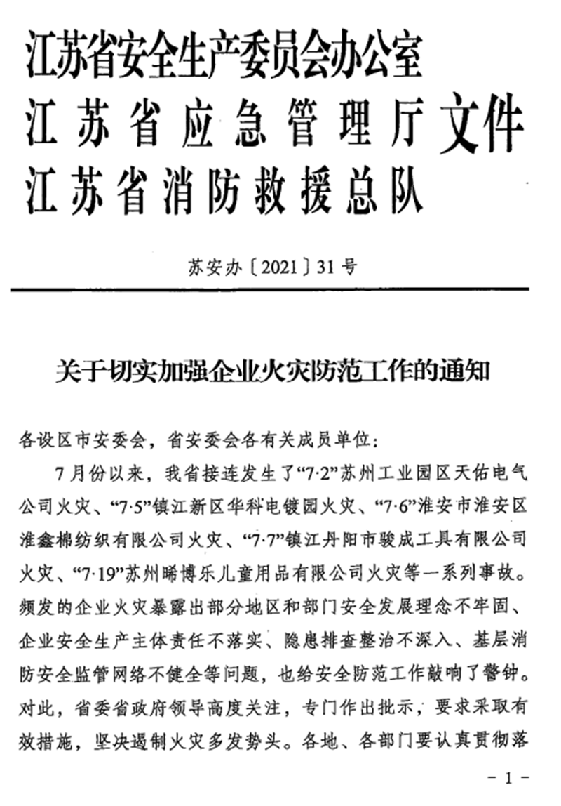 现将省安委办《关于切实加强企业火灾防范工作的通知》(苏安办〔2021〕31号)转发给你们,请认真研读文件要求,切实抓好贯彻落实。