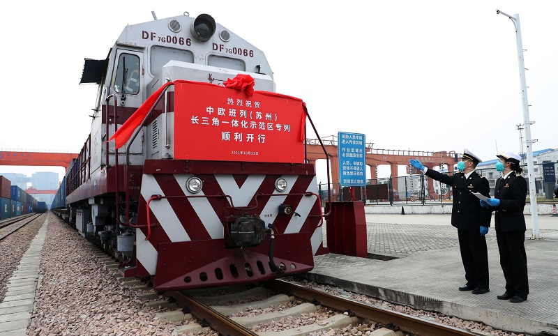 在长三角生态绿色一体化发展示范区成立两周年之际,今天(10月22日)下午,中欧班列长三角一体化示范区首列专列搭载100标箱、约700万美元货物在江苏(苏州)国际铁路物流中心启动开行,预计20天后将抵达波兰马拉舍维奇。苏州市委副书记、代市长吴庆文出席活动并讲话。