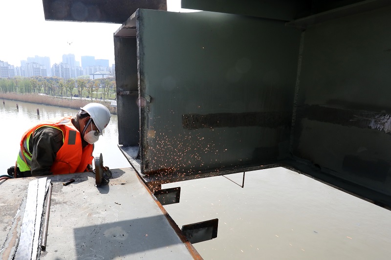 现场沧浪新城景观人行桥两边的船只暂停航运,桥梁上的工作人员切割主跨吊装段截面多余部分,以使吊装段接口贴合更加精准。苏州新城投资发展有限公司沧浪新城景观人行桥项目负责人平春生介绍,桥梁主跨合龙上下偏差不超过2毫米,以使桥面平整。