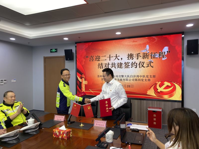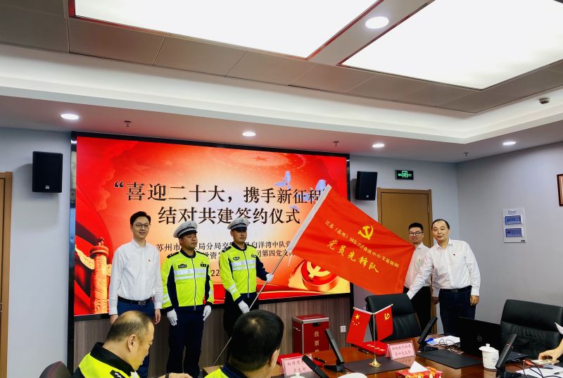 为迎接党的二十大胜利召开,进一步把组织活力转化为发展活力、把党建优势转化为发展优势,9月28日,新城投资公司第四党支部与白洋湾中队党支部以“喜迎二十大,携手新征程”为主题举行结对共建签约仪式,并组建成立“江苏(苏州)国际铁路物流中心交通保障先锋队”。金阊新城党工委书记邱炜,新城投资公司第四党支部和白洋湾中队党支部代表出席签约仪式。