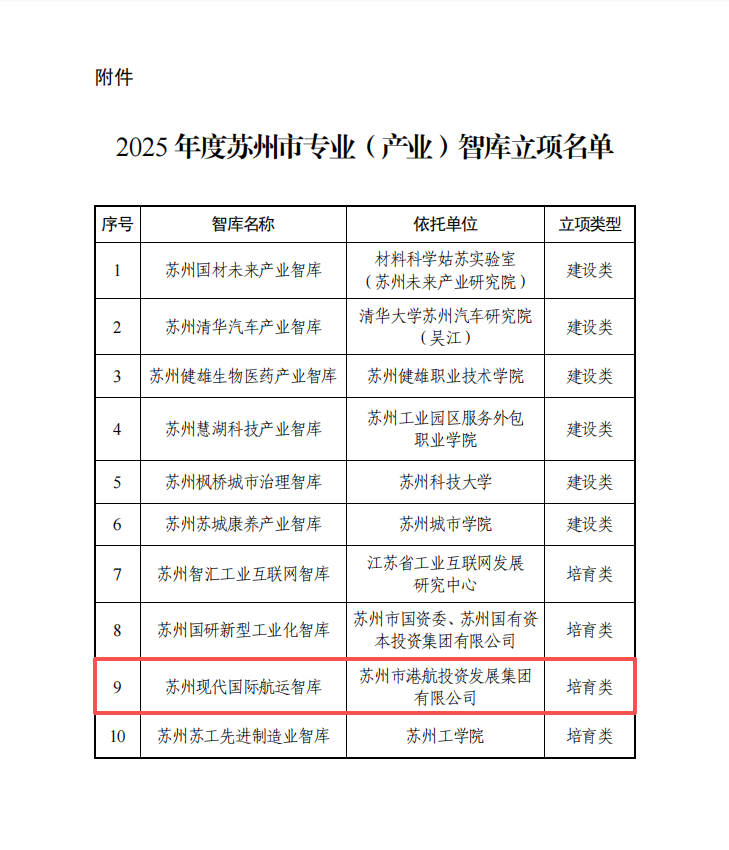 11月18日,苏州市新型智库建设办公室公布2025年苏州市专业(产业)智库立项名单。依托苏州港航集团的苏州现代国际航运智库(苏州港航集团发展研究中心)等10家智库入选2025年度苏州市专业(产业)智库立项名单。