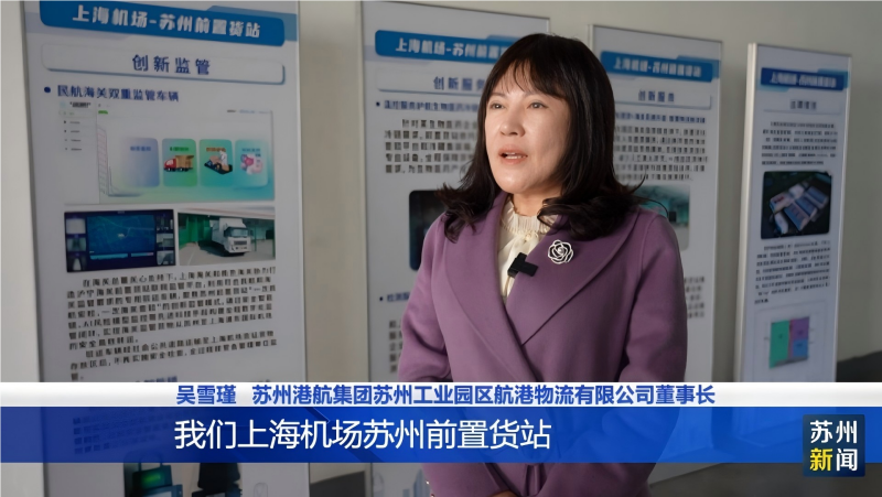 苏州港航集团苏州工业园区航港物流有限公司董事长吴雪瑾介绍,上海机场苏州前置货站是民航总局批准的全国第一个,也是目前唯一的一个,跨省市、跨关区的航空前置货站,货物在这边可以报关、称重、贴唛 ,在这边安检完了和海关查验结束以后,直接组板送上飞机,另外还建了一个专线,把所有的系统集成到一个平台上,在这个交通运输方面,它高效地达到了沪苏同城化的要求。
